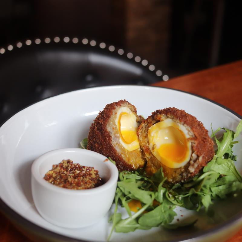 Soft-boiled egg wrapped in sausage and bread crumbs. Served with whole grain mustard